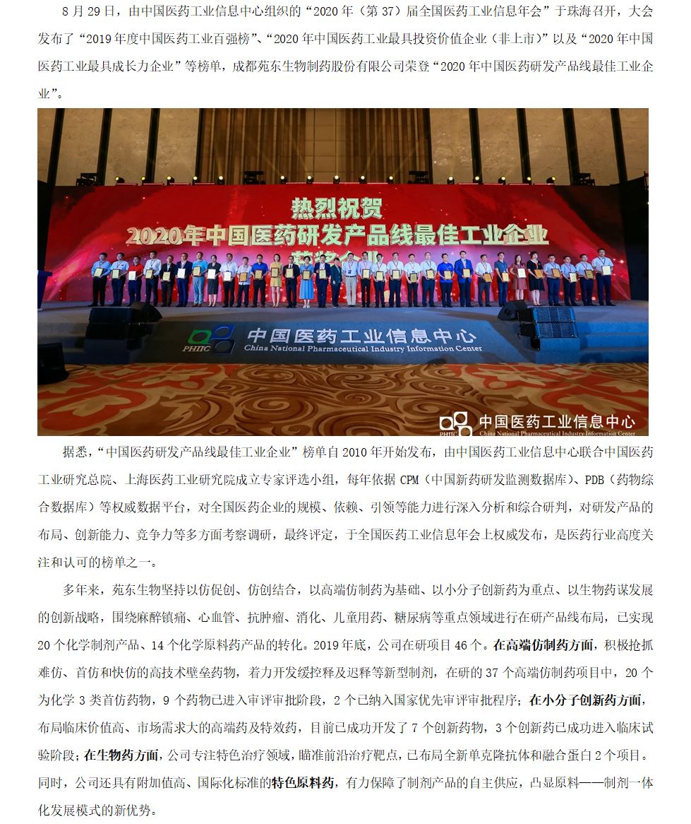 热烈祝贺尊龙凯时AG旗舰厅生物制药股份有限公司 荣获“2020年中国医药研发产品线最佳工业企业”奖